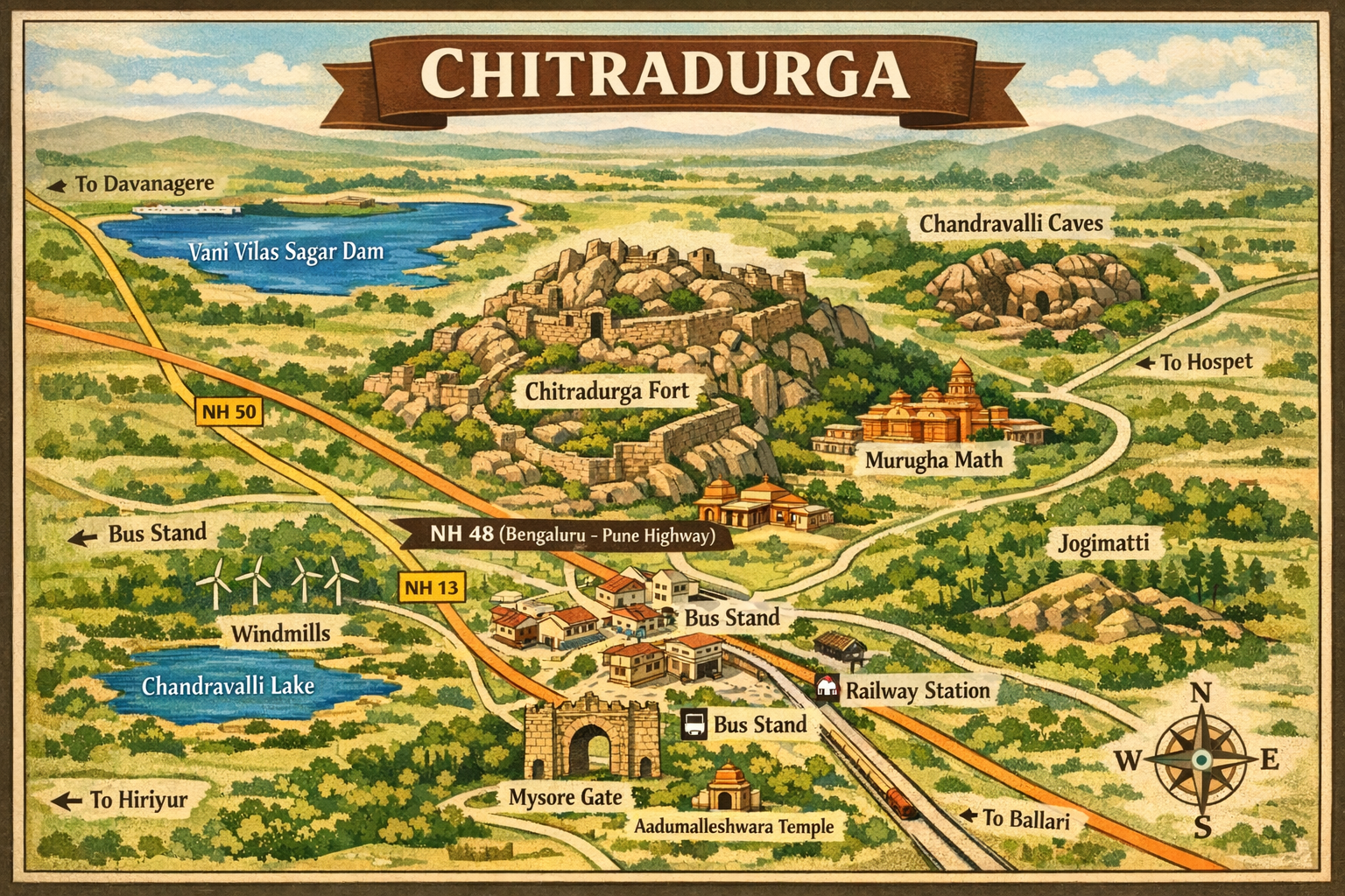 Chitradurga is known as the “Fort City of Karnataka,” famous for its historic Chitradurga Fort, rich Nayaka-era heritage, culture, and growing trade and education hub.